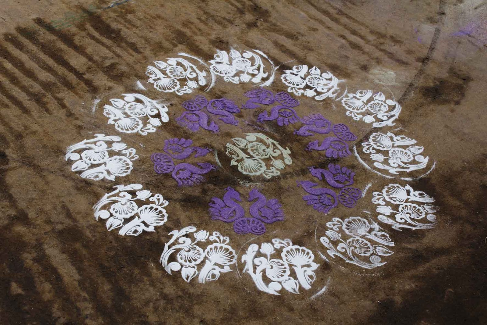 According to tradition the guests and inhabitants of a house should see the Rangoli before entering. The Rangolis, give a warm welcome to visitors and have the property to ward off evil spirits and attract positive energies.